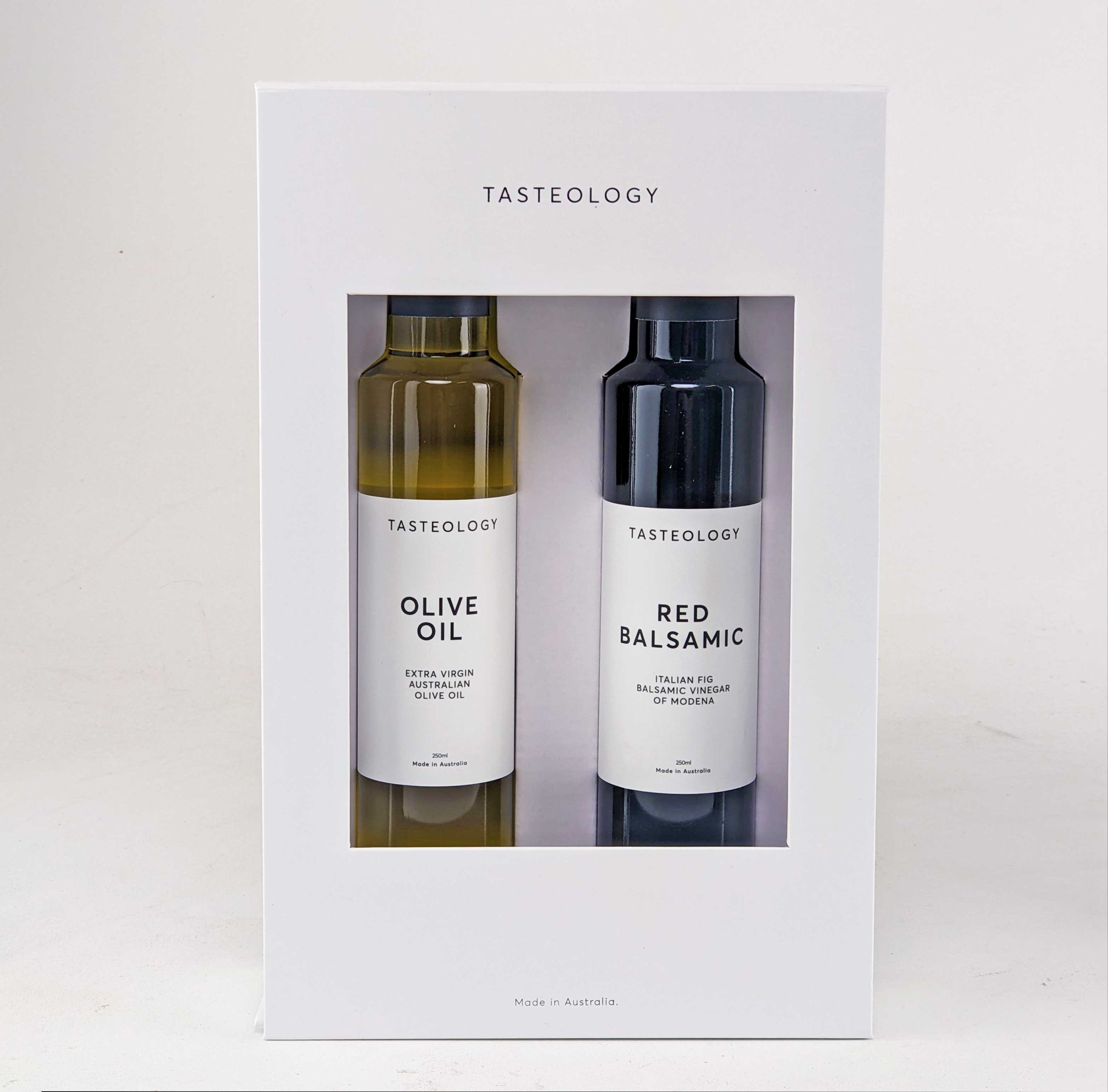 The extra virgin olive oil is 100% Australian grown and made. The Italian fig balsamic vinegar of Modena is bottled in Australia using a blend of local and imported ingredients.