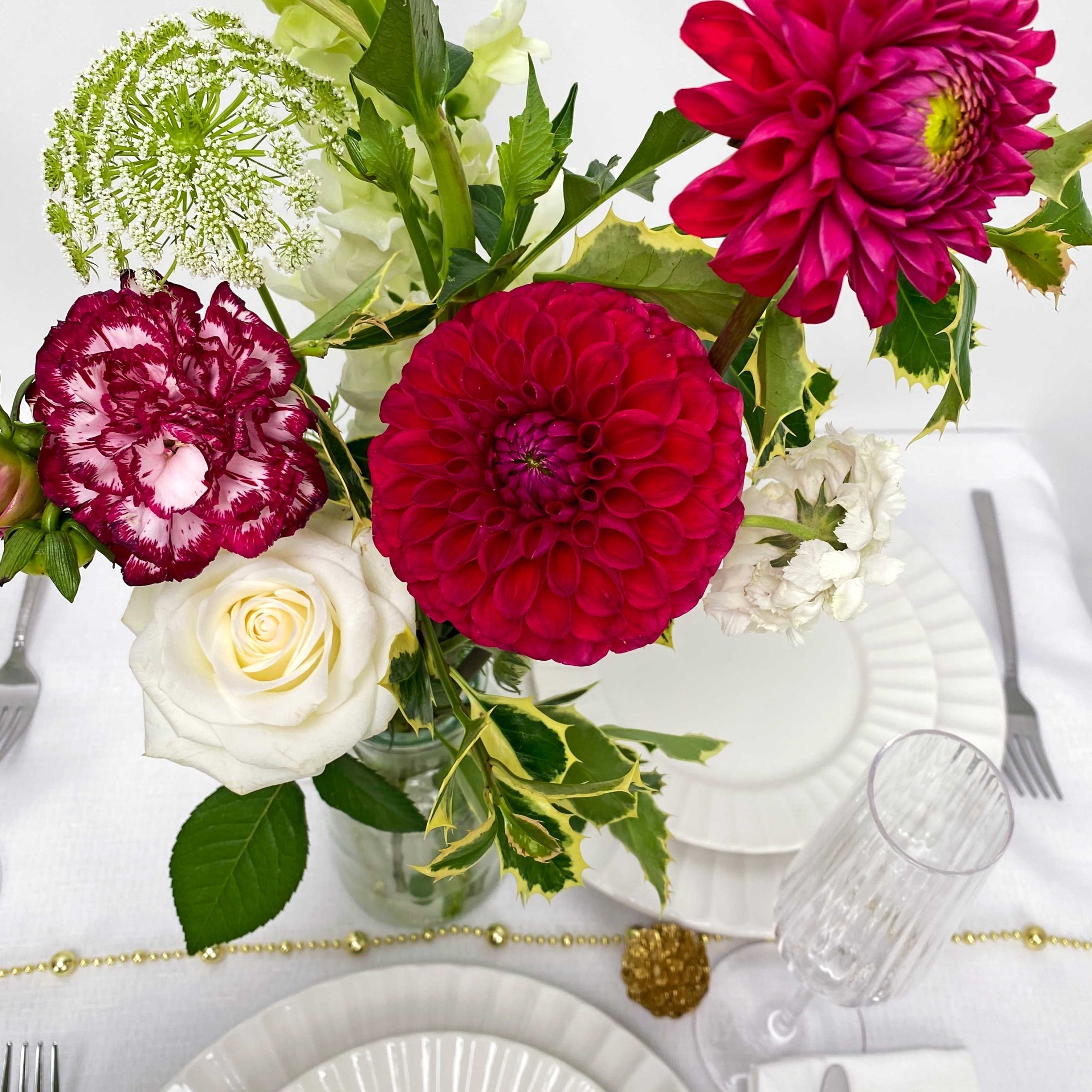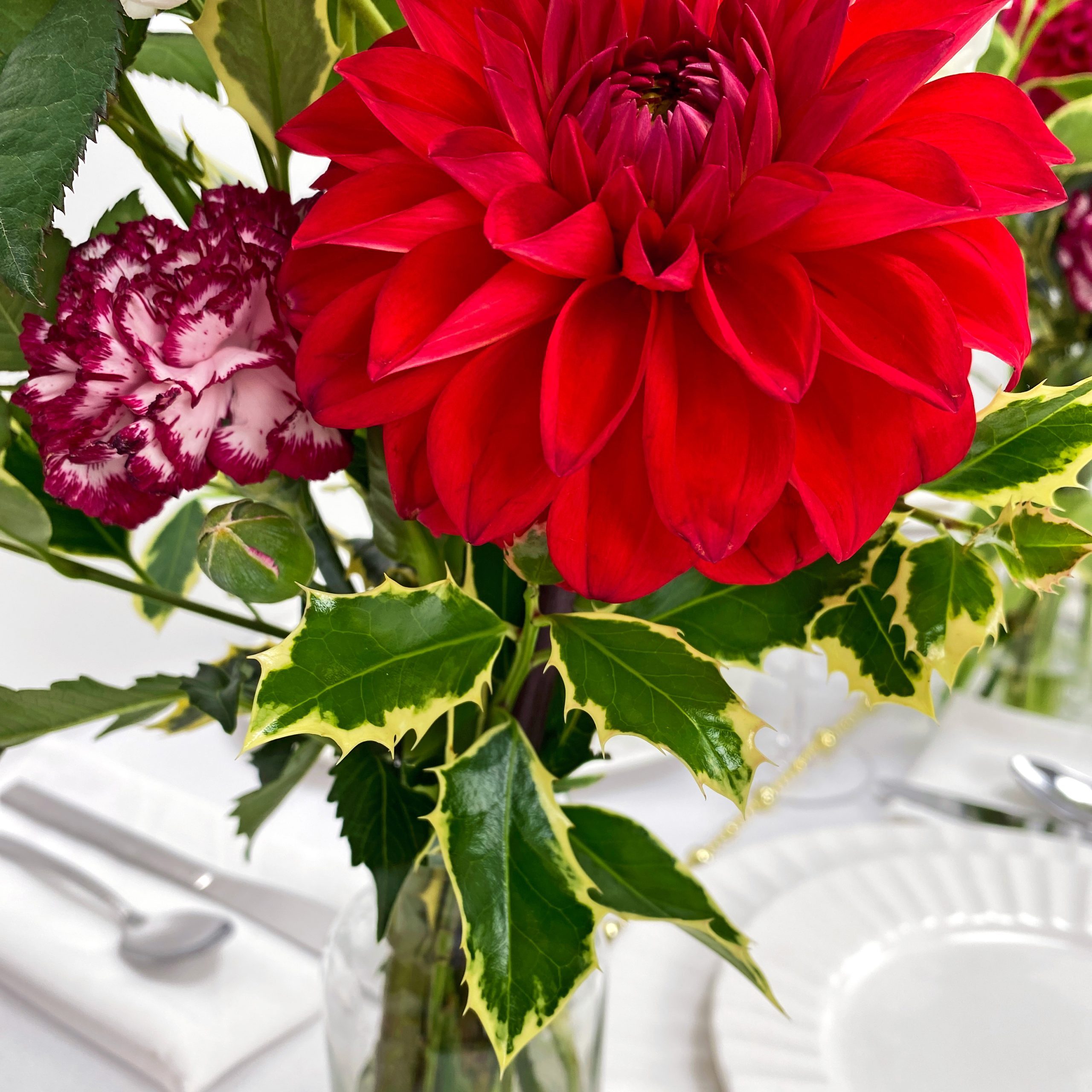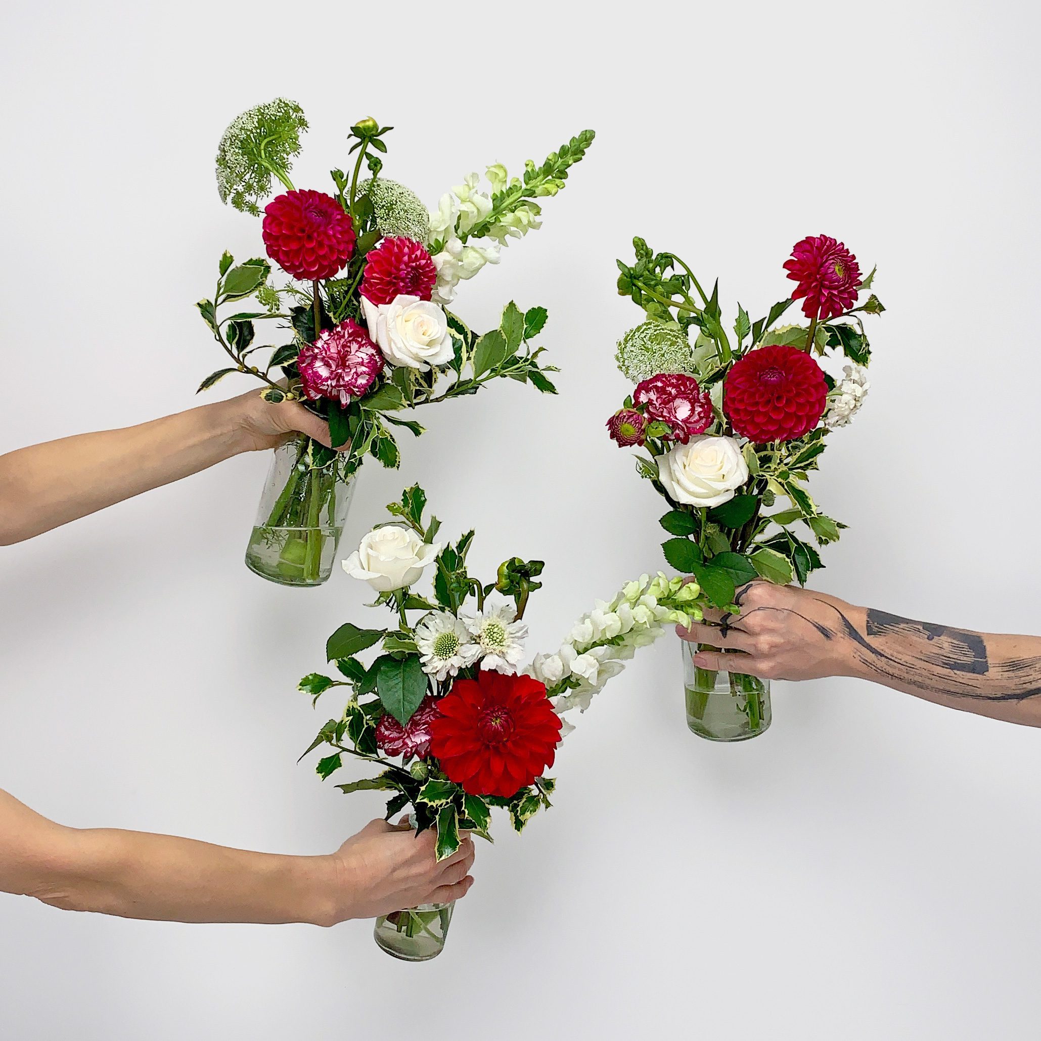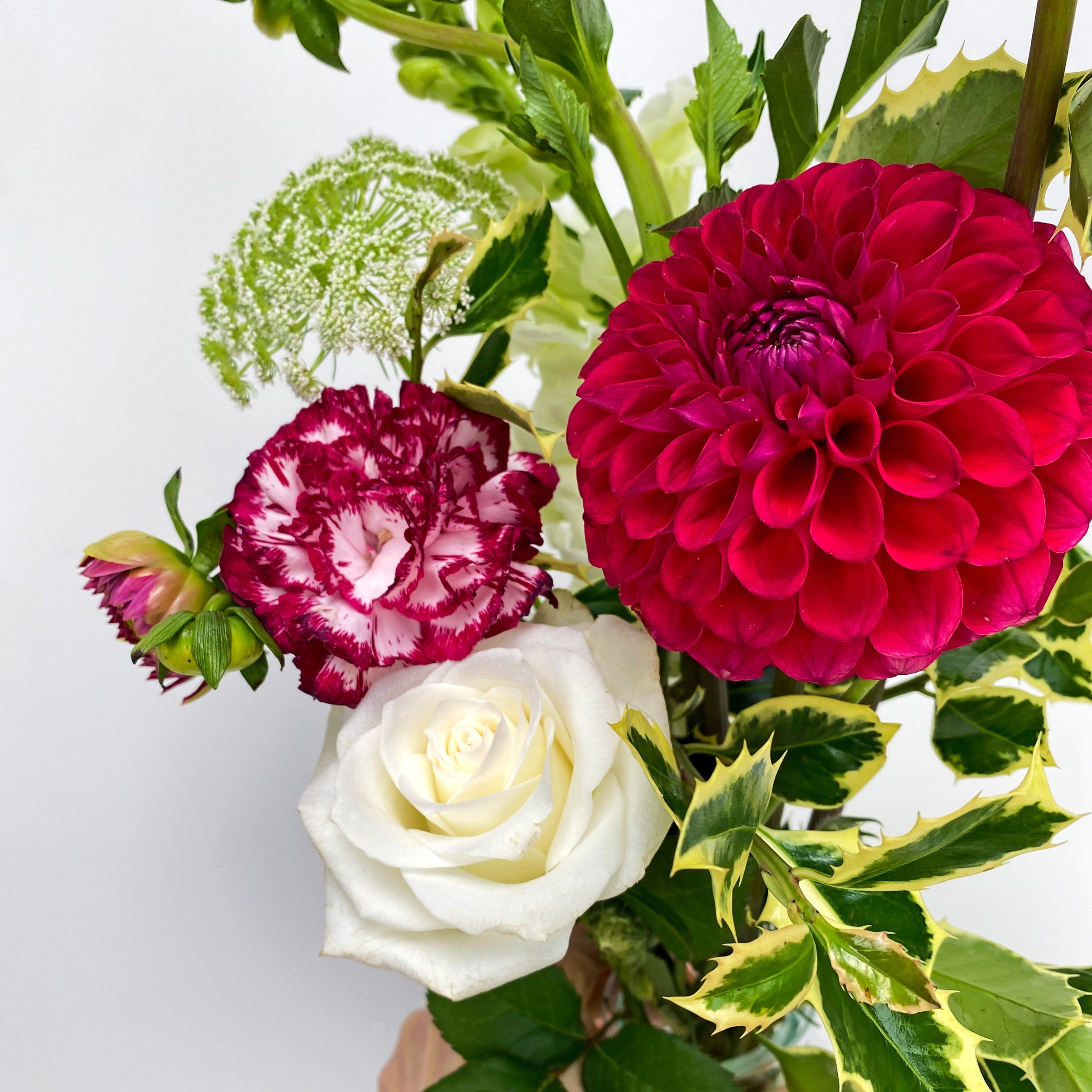 Our Mini Christmas Vases are the easiest way to add a little seasonal magic to your home or holiday gathering. Sold as a set of three, each vase comes ready-filled with a curated selection of fresh, locally grown Christmas blooms in joyful reds, whites and lush greens – no prep required. Display them together down the centre of your table, cluster them on a sideboard, or dot them throughout your space for small, simple pops of festive colour.