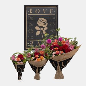 Every bouquet in this Valentine’s Day range comes wrapped in hessian that, when unwrapped, reveals a wonderful surprise: a limited-edition artwork.