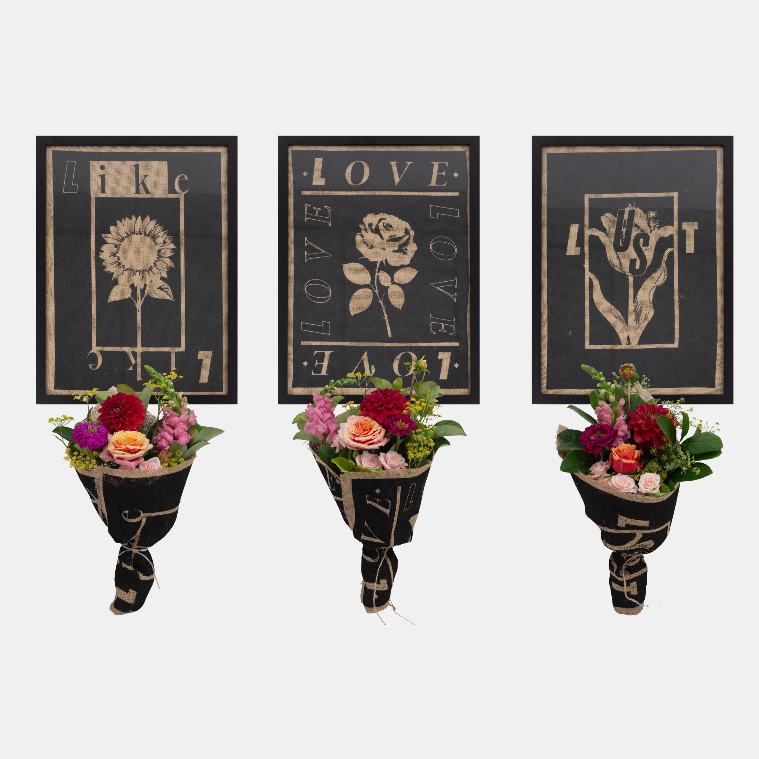 Every bouquet in this Valentine’s Day range comes wrapped in hessian that, when unwrapped, reveals a wonderful surprise: a limited-edition artwork.